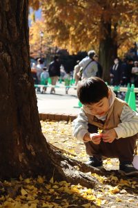 こどもが夢中になるのは、綺麗に紅葉したイチョウの木や落ち葉、、枝。